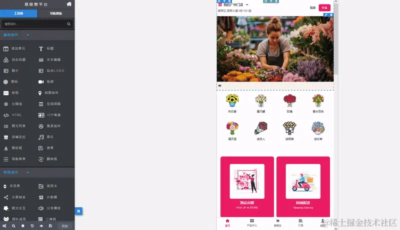 step3, 在线编辑修改站点内容,设计完成后,点击发布这样一个花草鱼虫市场小程序商城就制作完成了