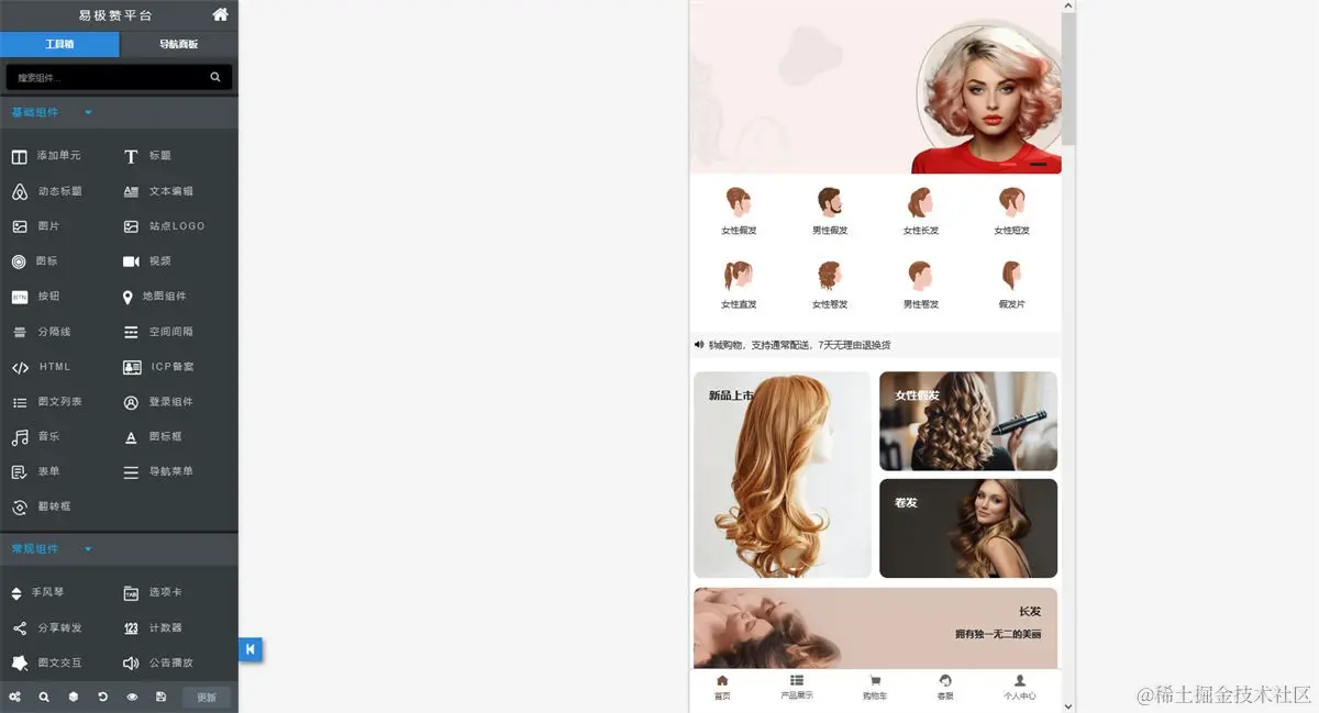 step3, 在线编辑修改站点内容,设计完成后,点击发布这样一个男士假发商城小程序就制作完成了