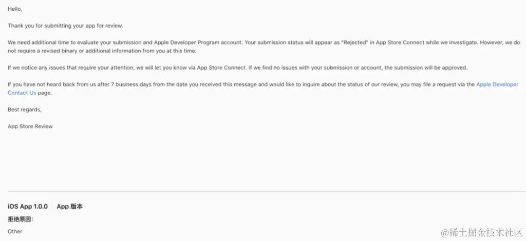 直到去年它变成这样的一条信息:我们需要用更多的时间来审核你的应用,如果你有任何问题的话,可以联系我们来进行申诉。 它不会给出具体打回的条款,而是直接告诉你打回的原因是other。