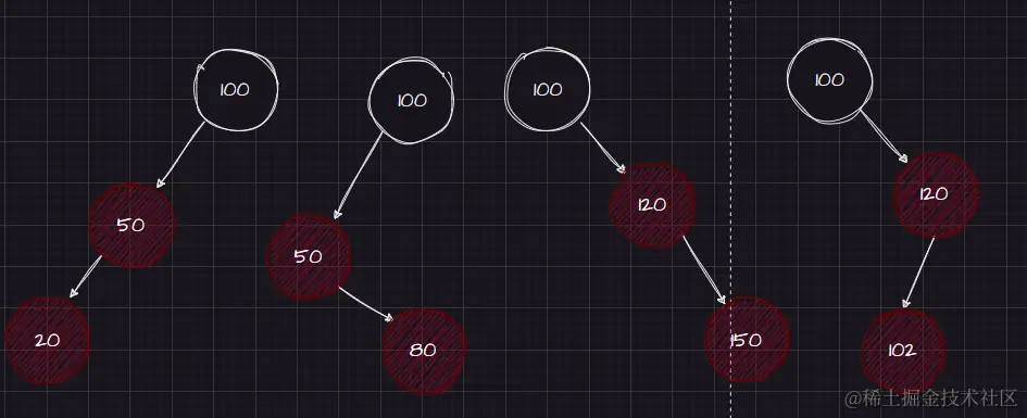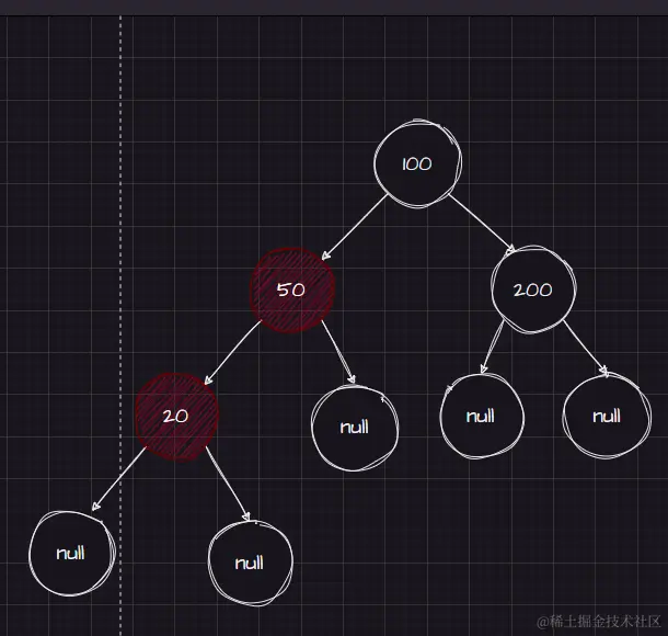 如上图,50和20为相邻的红节点,破坏了红黑树规则,需要调整;并且跟节点到最后一个节点的路径不相同,红节点不计算在内,左边为2的长度,右边为3的长度,破坏红红黑树规则