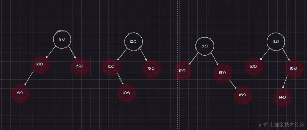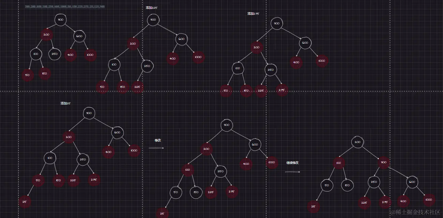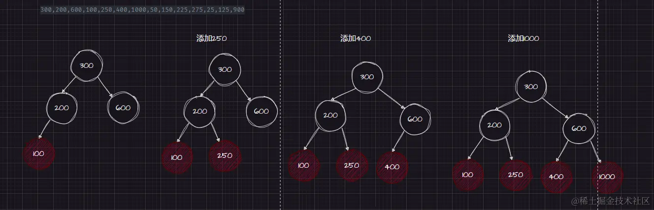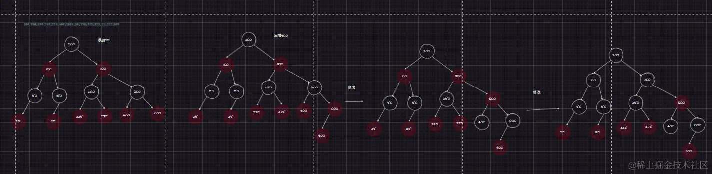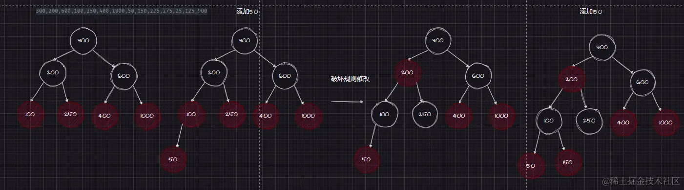 把300, 200, 600, 100, 250, 400, 1000, 50, 150, 225, 275, 25, 125, 900数字依次添加,但是添加都是红节点
