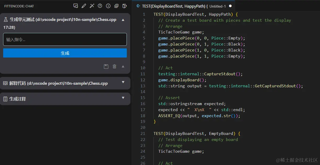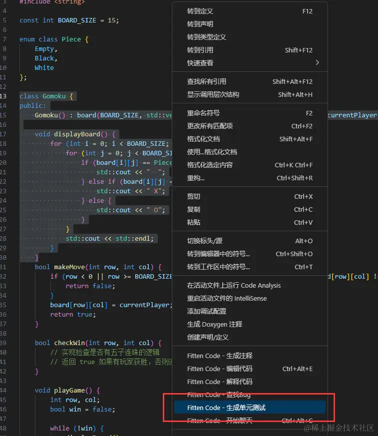Fitten Code 拥有自动生成单元测试的功能,可以根据代码自动产生相应的测试用例,提高代码质量和可靠性。通过选中代码段后右键选择 "Fitten Code – 生成单元测试" 来实现,如下图所示: