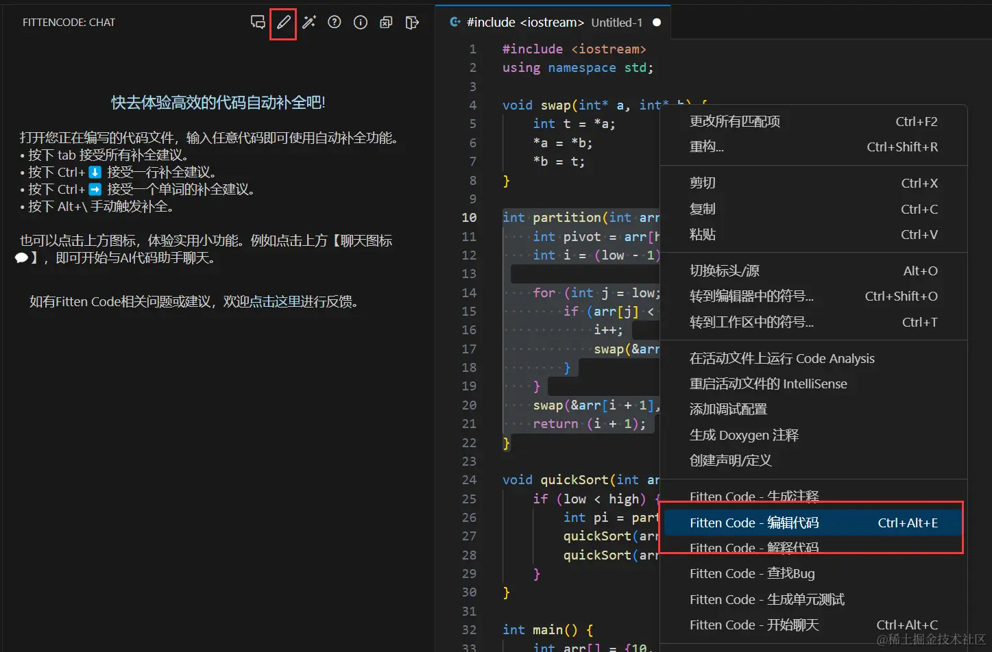 编辑代码功能可以实现不同语言之间的转换,如Python语法转换成C++语法等。选中需要进行编辑的代码段,右键选择 "Fitten Code – 编辑代码" 或点击左侧工具栏中的 "Fitten Code – 编辑代码" 或者使用快捷键 Ctrl+Alt+E (mac系统为Control+Option+E),如下图所示: