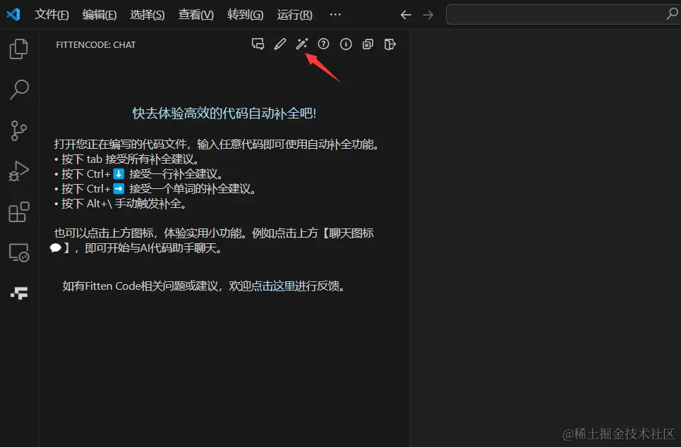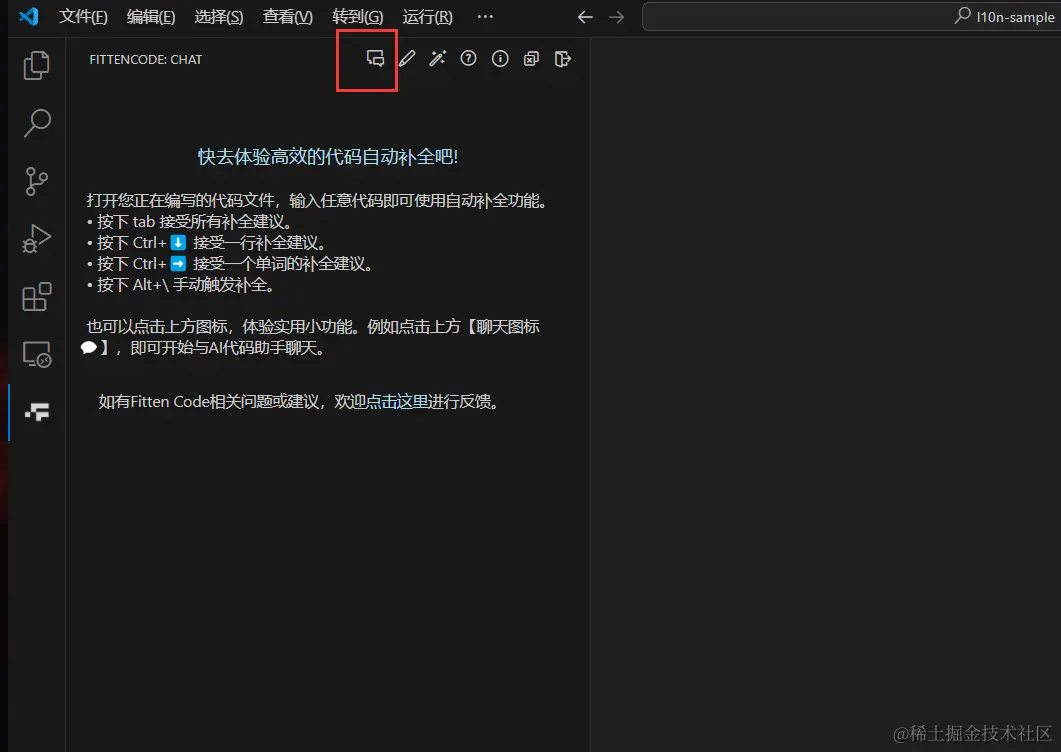 用户可通过点击左上角工具栏中的Fitten Code – 开始对话或者使用快捷键Ctrl+Alt+C(mac系统为Control+Option+C)打开对话窗口进行对话: