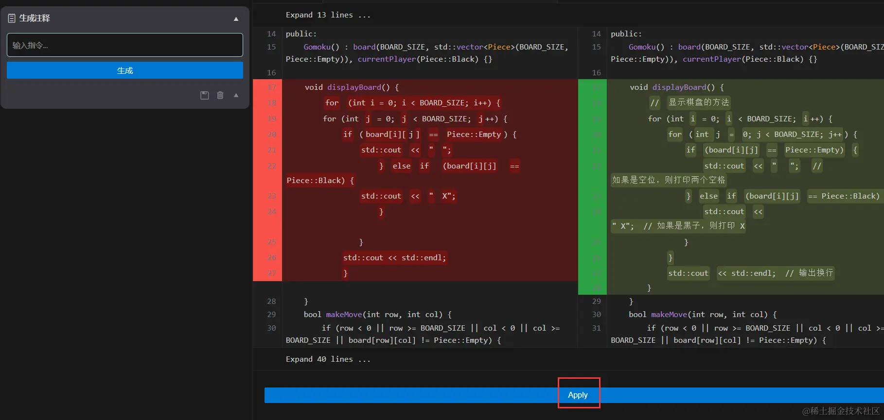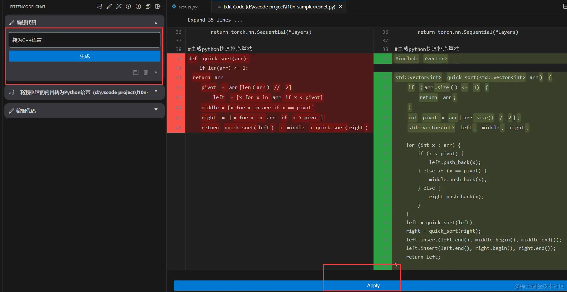 随后,用户可在输入框中输入指示,Fitten Code 会新建一个窗口对比显示更改前和更改后的内容,用户可通过点击 "Apply" 应用更改,如下图所示: