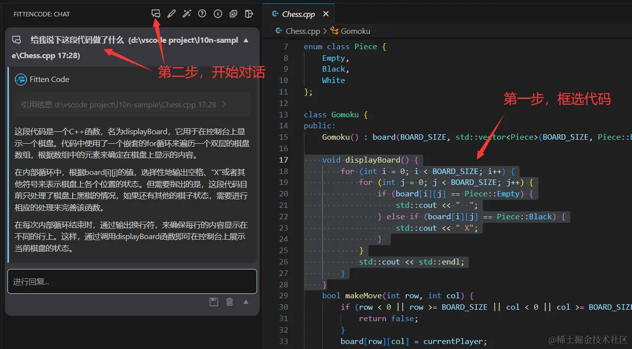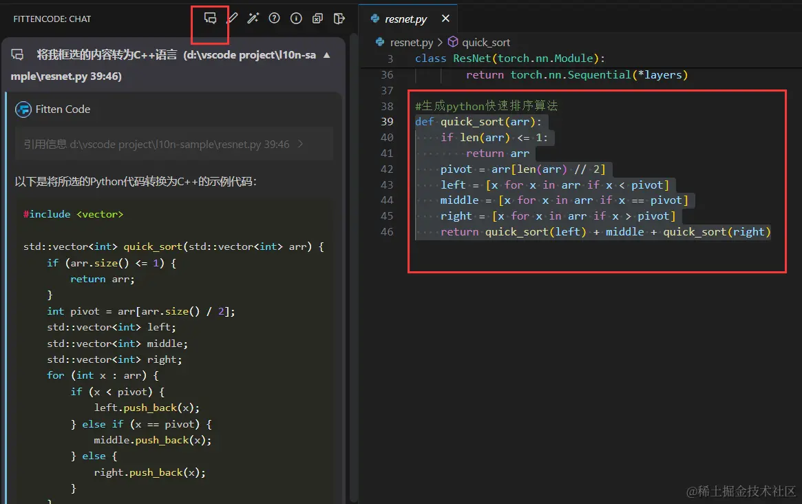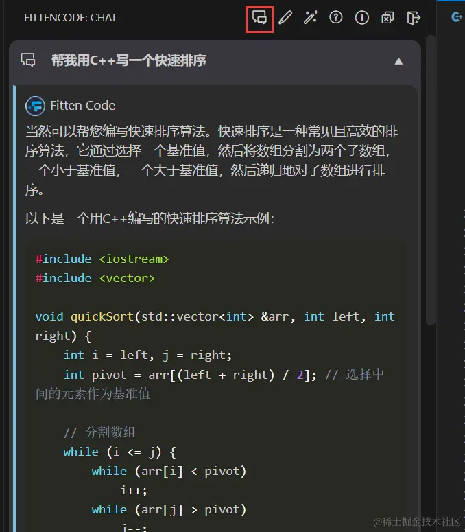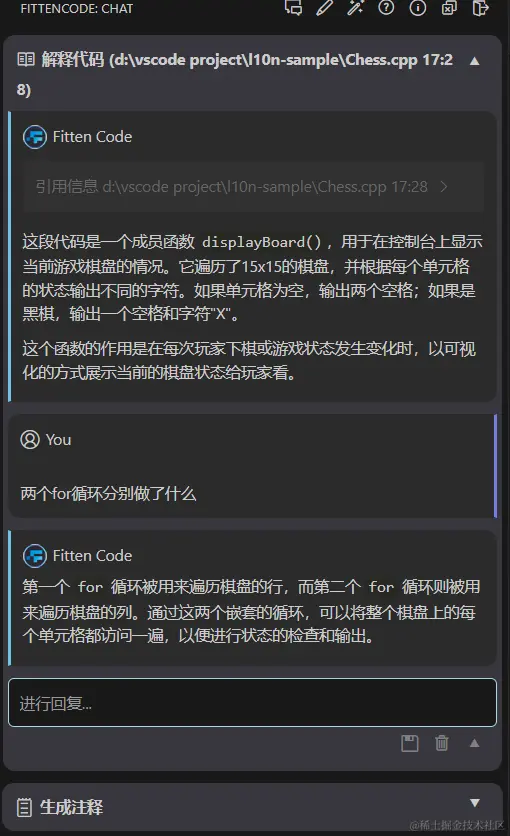 当用户选中代码段再进行对话时,Fitten Code 会自动引用用户所选中的代码段,此时可直接针对该代码段进行问询等操作: