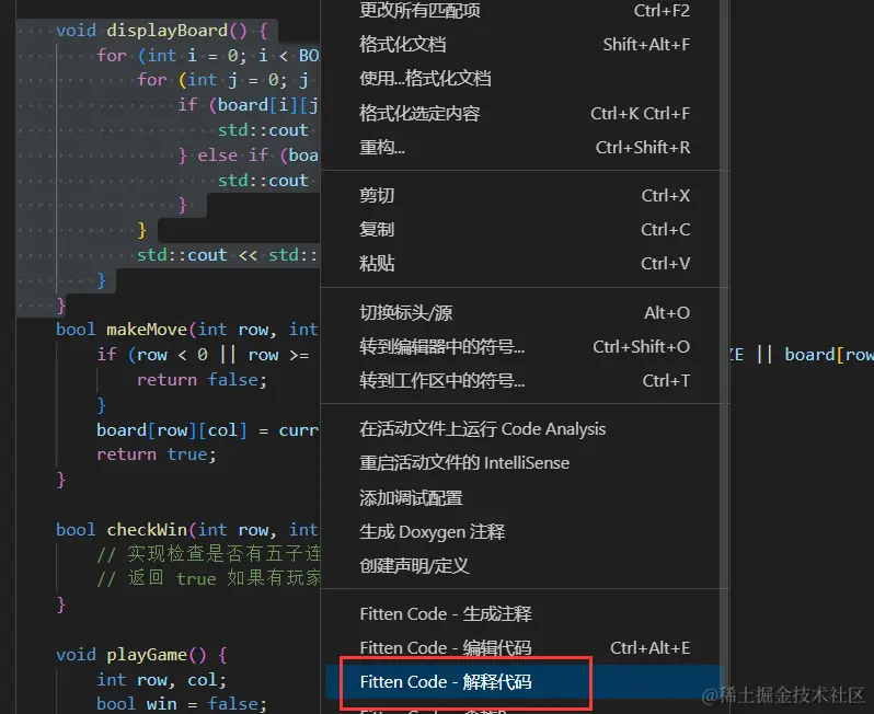 Fitten Code 可以对一段代码进行解释,可以通过选中代码段然后右键选择 "Fitten Code – 解释代码" 进行解释,如下图所示: