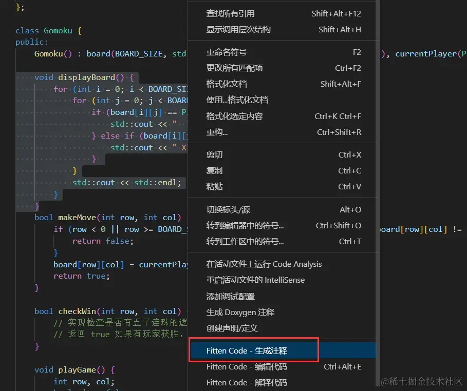 Fitten Code 能够根据您的代码自动生成相关注释,通过分析您的代码逻辑和结构,为您的代码提供清晰易懂的解释和文档,不仅提高代码的可读性,还方便其他开发人员理解和使用您的代码。先选中需要生成注释的代码段,然后右键选择 "Fitten Code – 生成注释":