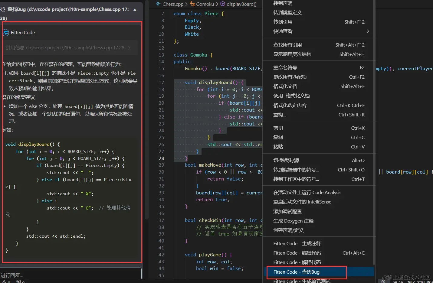 Fitten Code 可以对一段代码检查可能的 bug,并给出修复建议。选中对应代码段,然后右键选择 "Fitten Code查找Bug",如下图所示: