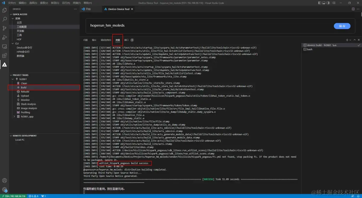 样例代码下载完成后,DevEco Device Tool会重新要求连接远程服务器,输入密码连接后会进入对应的代码编辑界面,此时点击左下角DevEco插件图标,选择PROJECT TASKS可以查看到对应的样例工程,点击build选项进行编译,并可在终端查看对应的编译结果。