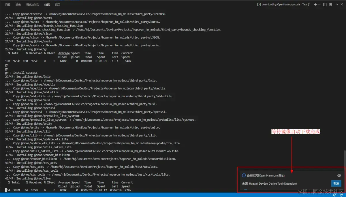 当左下角显示正在下载OpenHarmony镜像时,耐心等待下载完成即可。