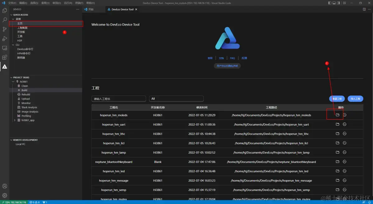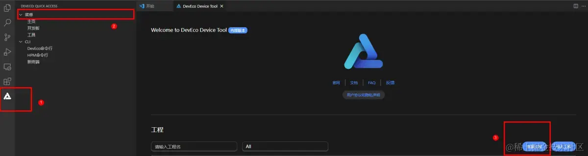 点击左下角DevEco插件图标,然后点击左边框出现的主页,弹出主页界面,主页中选择新建项目,如下图: