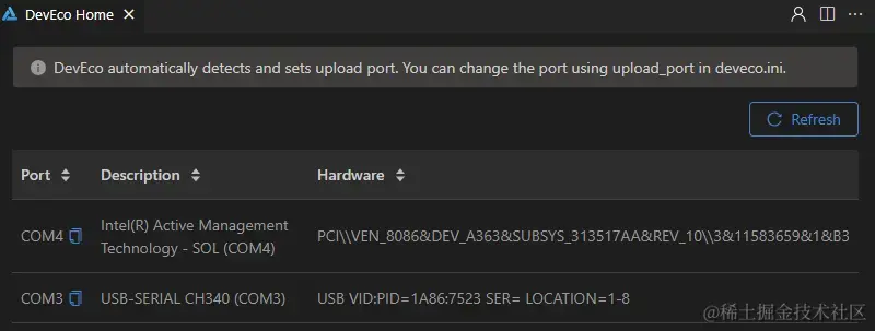 在配置烧录前需要先查看DevEco Device Tool是否可以正常识别串口。