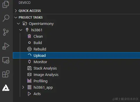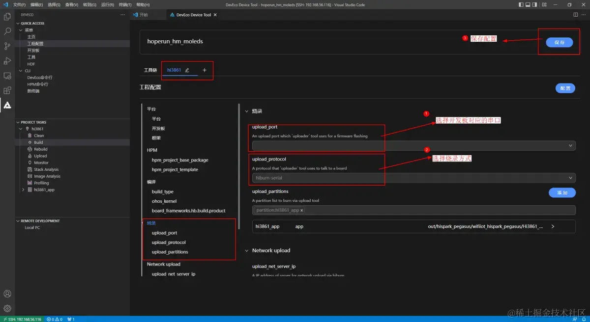 - 所有的配置都修改完成后,在工程配置页签的顶部,点击Save进行保存。点击Open打开工程文件,然后在“PROJECT TASKS”中,点击hi3861下的Upload按钮,启动烧录。