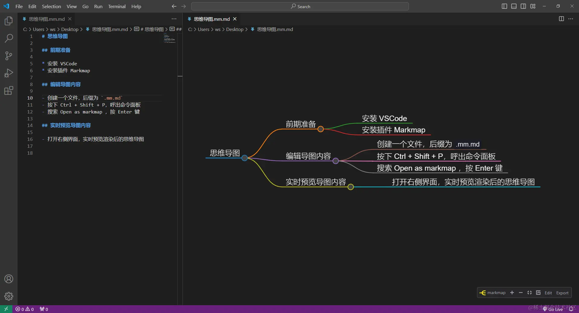 除了 boardmix AI,如果你是一个喜欢使用 VS Code 来编辑文本内容的极客,这里还有另外一种将 Markdown 快速转换为思维导图的方法,那就是借助一个 VSCode 插件 Markmap。