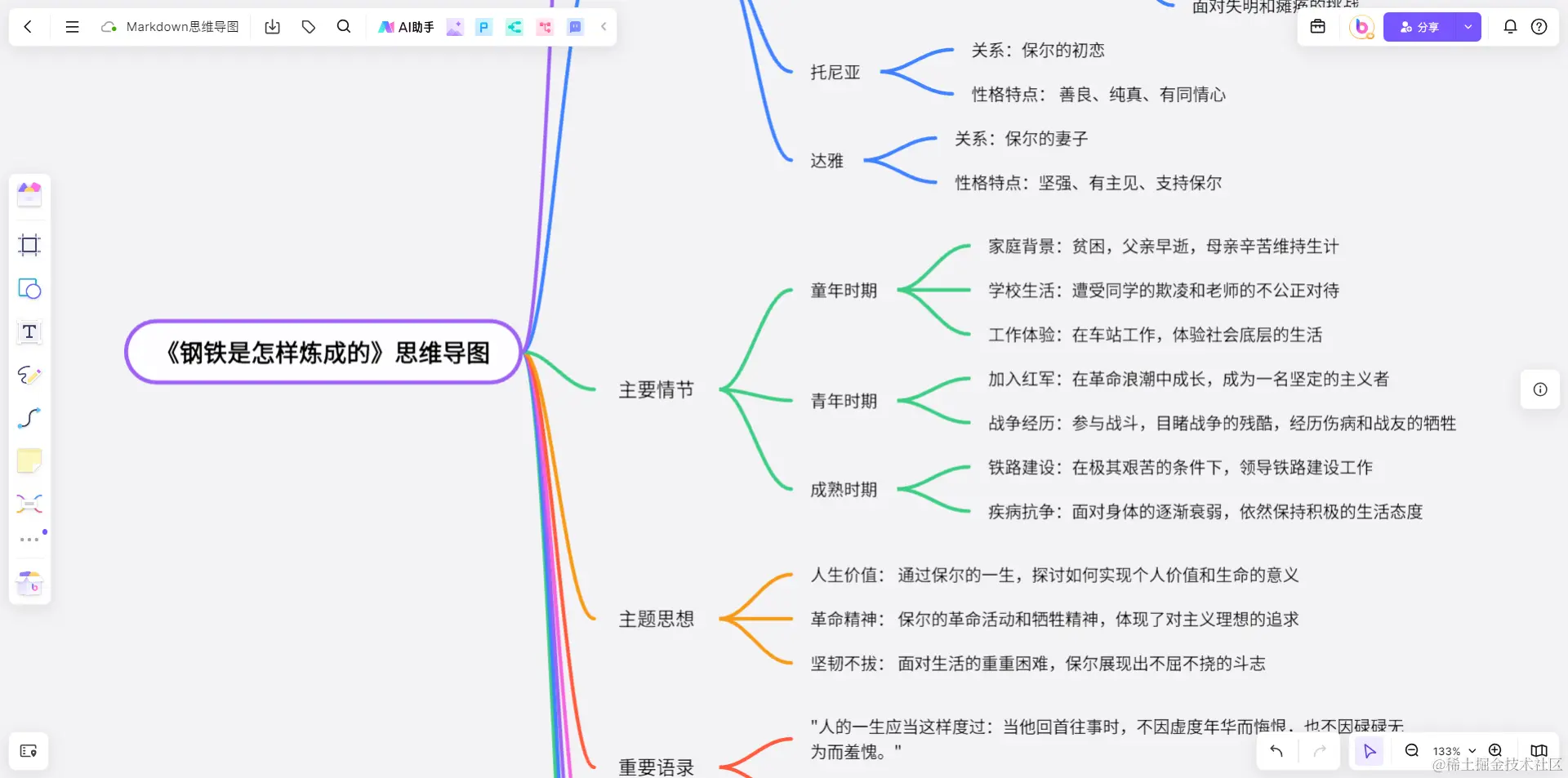 经由 boardmix AI 提炼后,导入的 Markdown 文件自动转换为下图所示的思维导图,Markdown 的一级、二级、三级标题,依次对应思维导图各个层级的节点。