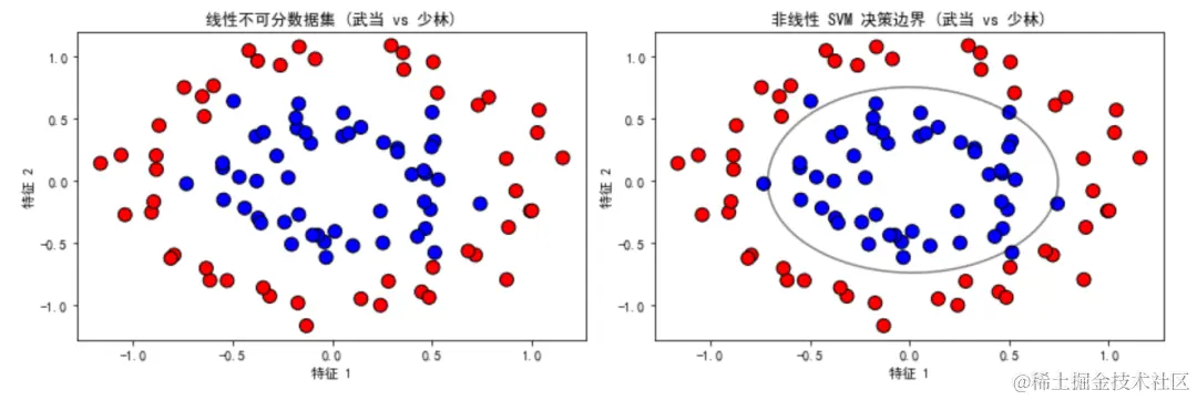 make_circles函数生成圆环形数据,模拟 "武当" 和 "少林" 门派的数据,代表非线性可分的情况。 - 可视化数据集:通过颜色区分不同门派的数据点,并标注出两个特征的坐标。