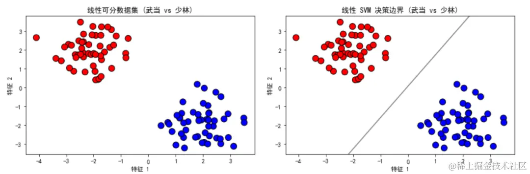 plot_data(X_linear, y_linear, "线性可分数据集 (武当 vs 少林)", axes[0, 0])