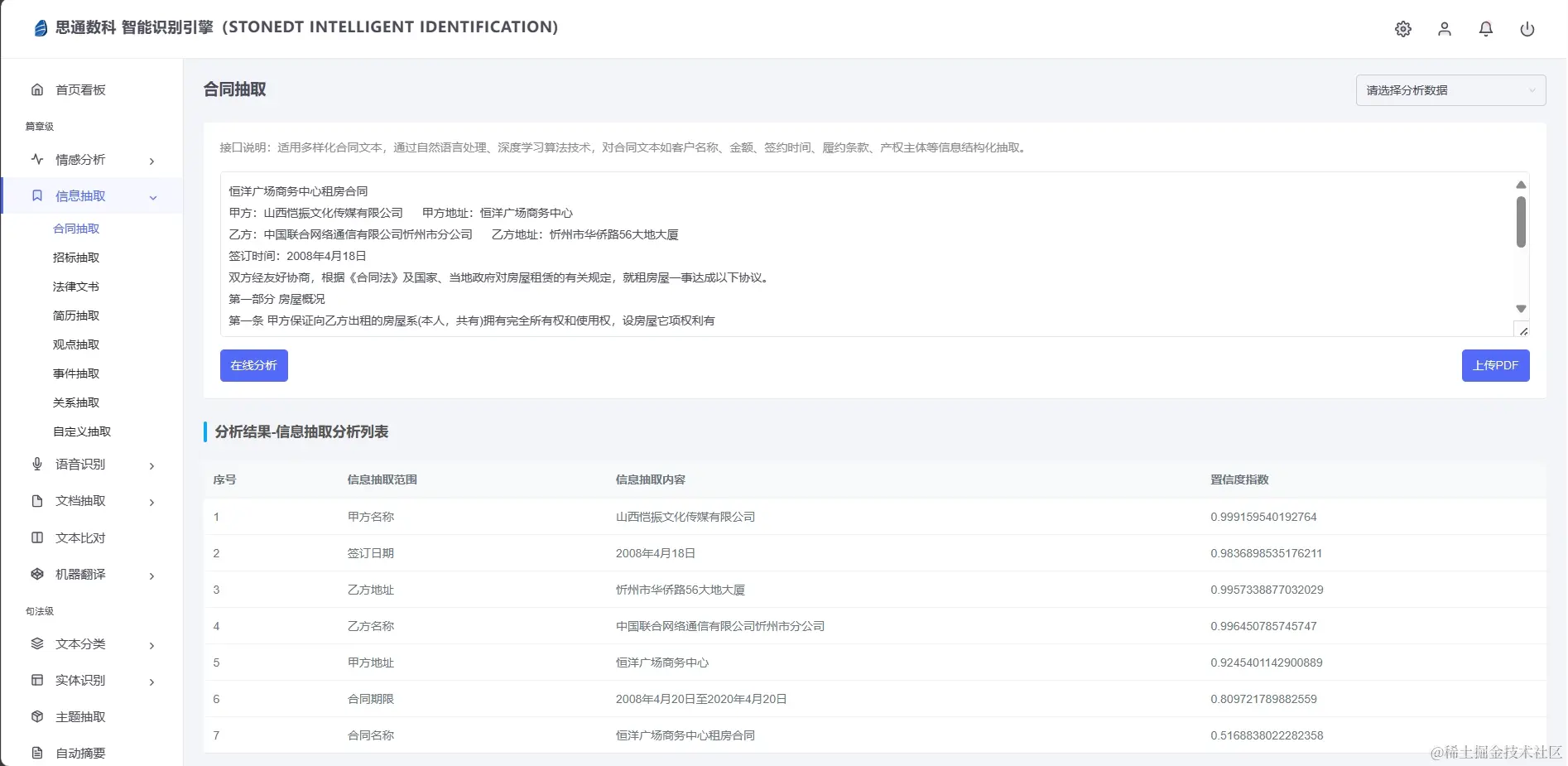 思通数科大模型通过整合OCR和NLP技术,提供了一个全面的合同解析解决方案。该模型首先使用OCR技术将合同文档转换为文本数据,然后利用NLP技术进行深入分析,提取合同中的关键信息。这一过程不仅提高了合同信息处理的效率,还通过自动化减少了人为错误的可能性。
