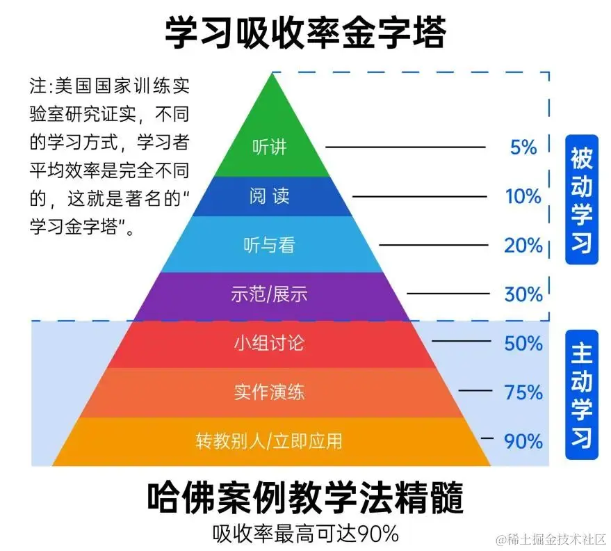由此可见,学习者通过讨论、实践、传授等主动方式,所获得的知识,要比通过听、读、观察这些被动的学习模式,要高效得多。换句话说,用输出倒逼输入,才是提高知识吸收率的关键。这也是春哥为什么一再强调“要教会大家”的深层原因。