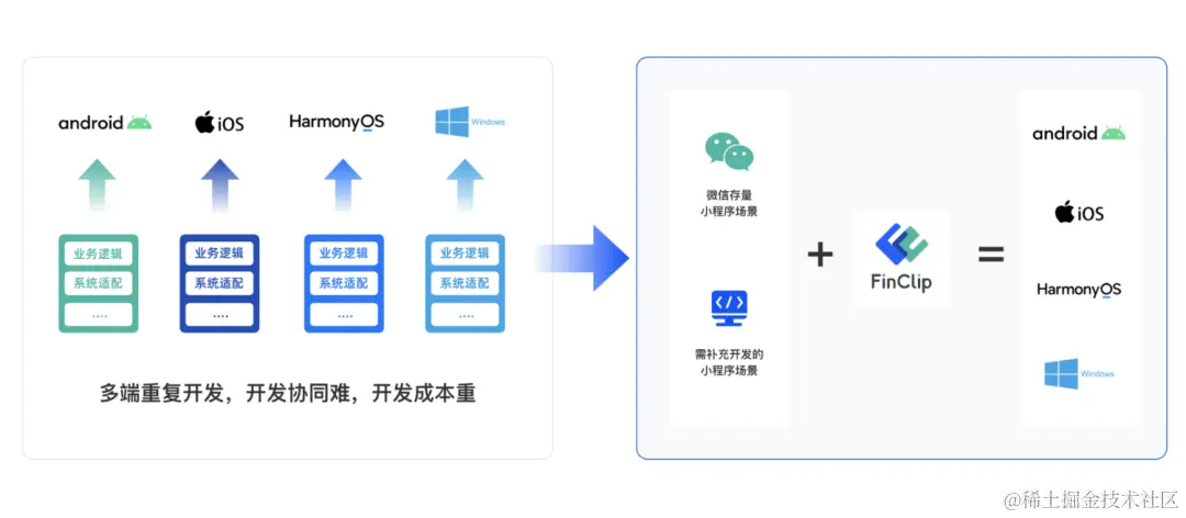 特别是,最新版的 HarmonyOS 将进入独立生态体系,不再兼容安卓应用。需要构建一套基于鸿蒙原生 APP 的服务,以保障鸿蒙用户的业务连续性。如果现在想要开发一个全新的鸿蒙版 App,就只能把 APP 使用鸿蒙的语法从 0 到 1 进行完全重写。这样无论是时间成本还是人力成本都无疑是巨大的。那有没有更便捷、更高效的解决方案呢?