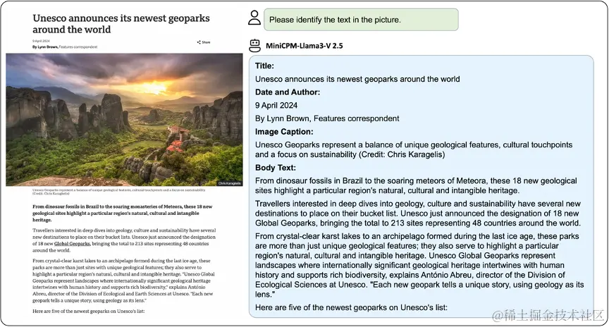 MiniCPM-Llama3-V 2.5 不仅仅能理解图像中的文字,还能深入洞察图像,在更复杂、更接近人类的水平上进行思考和解决问题。例如,面对一张充满繁密字迹的建筑风景图,模型不仅能够识别出《三体》主题,还能正确推理出这些建筑是为了纪念《三体》及其对中国科幻文学的贡献而设计。