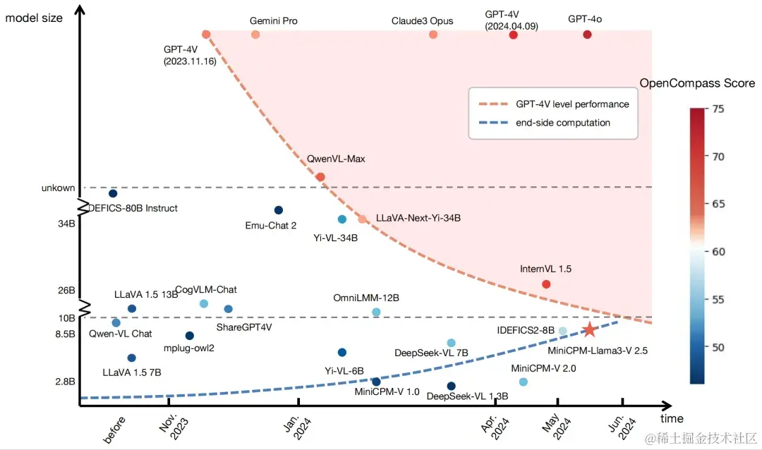 - 多模态综合性能: 在 OpenCompass 平台上,MiniCPM-Llama3-V 2.5 以 8B 的参数量级,综合性能超越了 GPT-4V 和 Gemini Pro,展现了小模型大潜力的优势。
