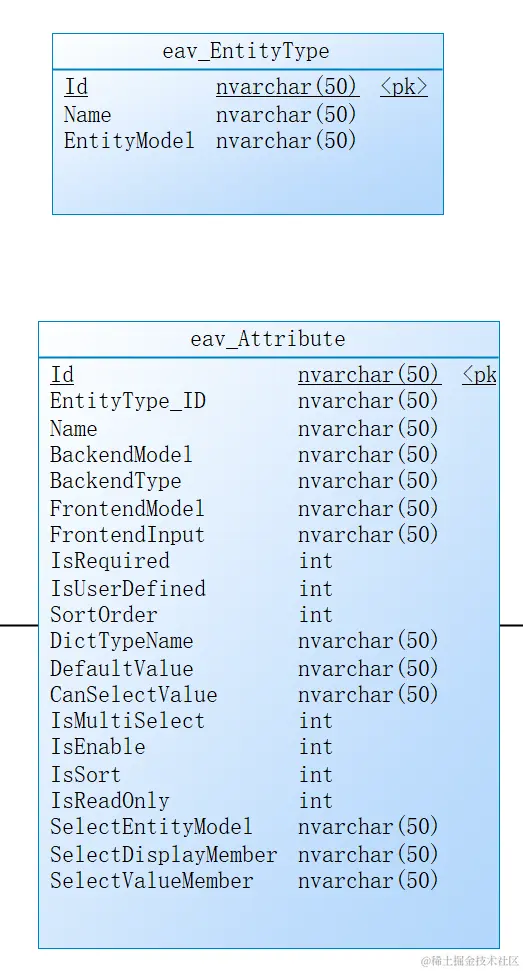 我们的EAV模型设计中,实体类型和属性的定义是放在关系型数据库(如SqlServer、Oracle等)中出存储的,如下所示。