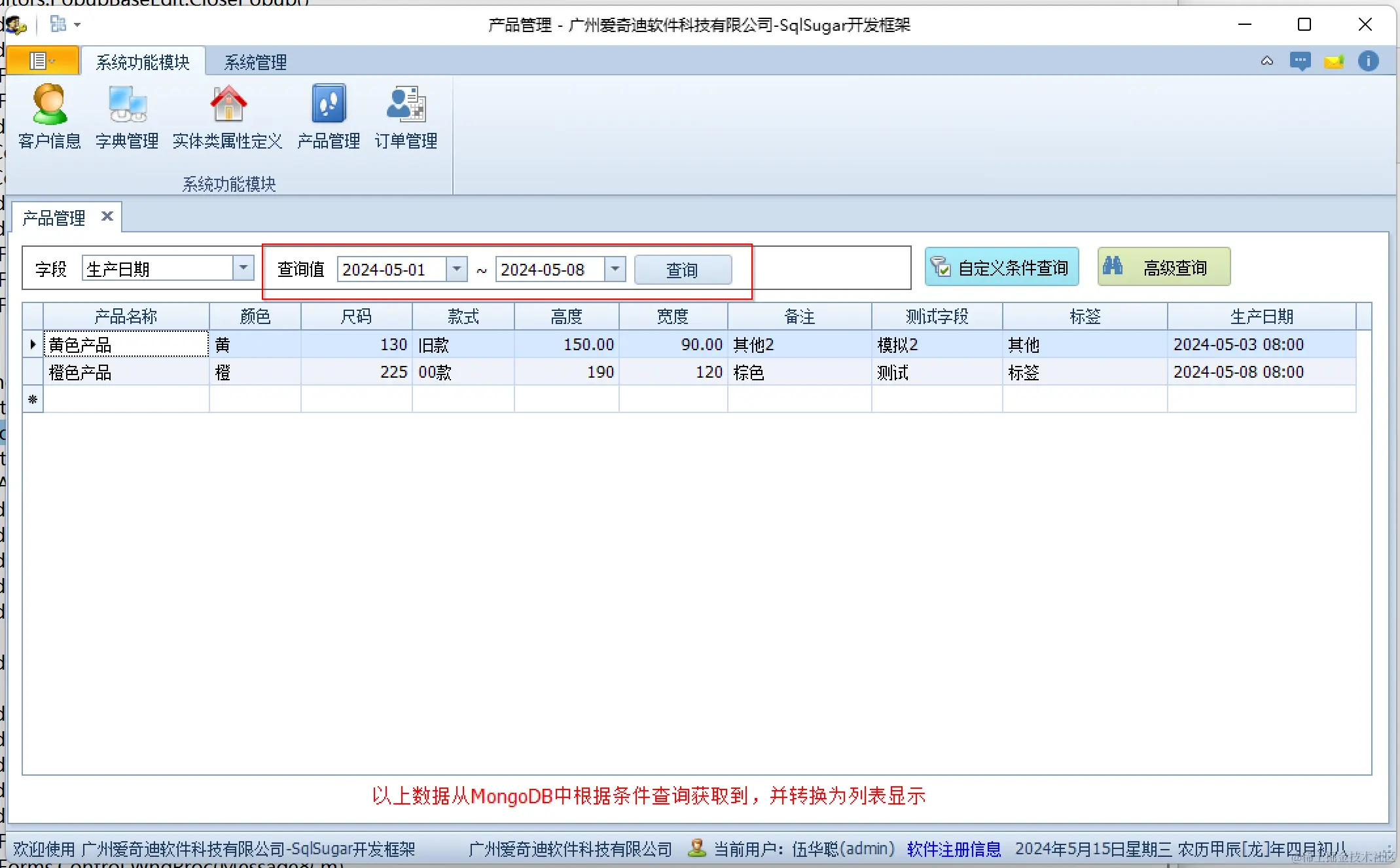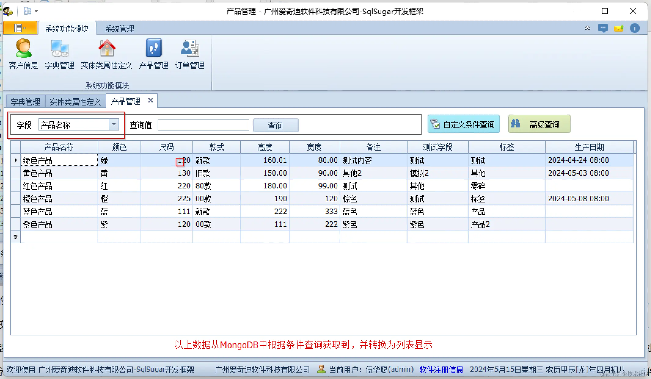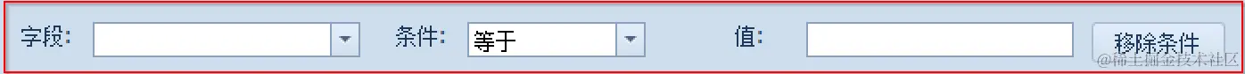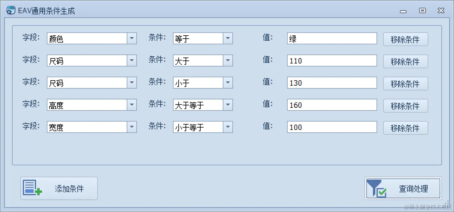 那这样,我们的查询字段就可能需要动态化了,但是WInform没有BS前端那样比较容易定制界面布局,因此我们换一种思路来解决这个问题,把查询字段通过列表选择的方式,条件根据不同的数据类型来创建不同的输入控件来实现,如下所示。