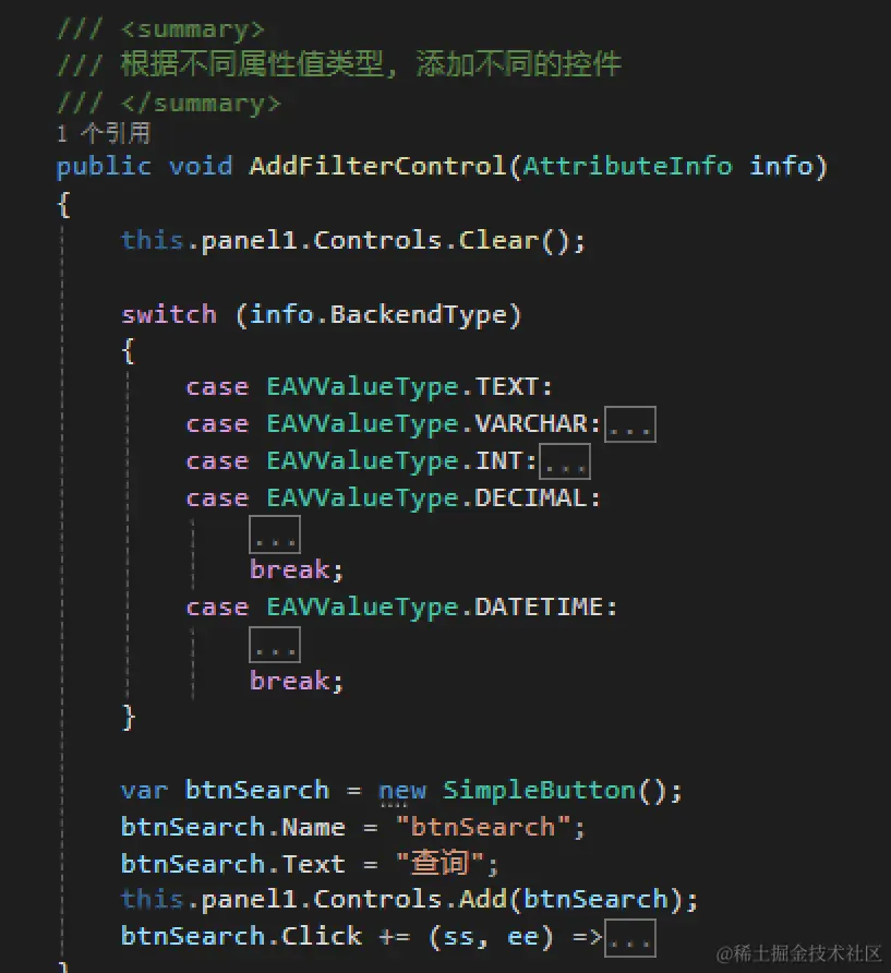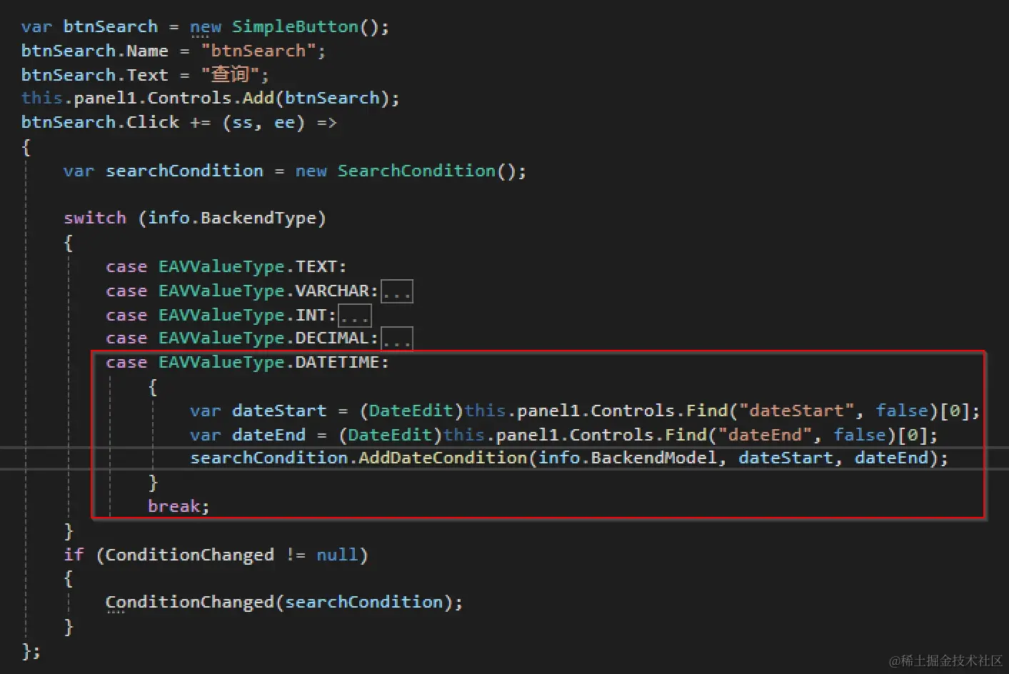 在我们触发查询按钮的事件的时候,根据面板的控件内容,进行查询的处理代码如下所示。