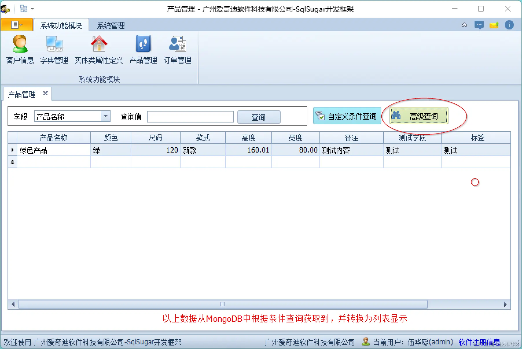 高级查询的界面弹出一个窗体,在里面的条件双击内容输入即可,一般文本是模糊查询,数值和日期是区间查询。如下界面所示。
