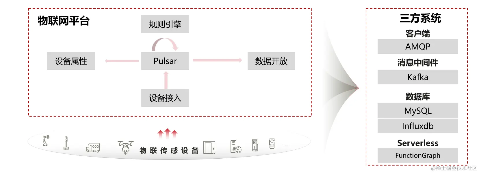 **以华为云IoT & Apache Pulsar/BookKeeper的合作为例。**物联网平台的核心模块消息中间件。整个业务流程为南向数据流从设备接入到Pulsar,经过规则引擎进行过滤、转换、增强等操作,再回到Pulsar,最后从设备接入进来,数据到Pulsar,经过规则引擎处理,再回到pulsar,最后由数据开放服务对外开放对接到其他第三方应用。规避了传统的消息组件扩展性受限、topic量级受限、消费模型单一等问题。同时华为云IoT也在Apache Pulsar以及下游项目,在安全、稳定特性上做了很多贡献,包括一些tls的校验、一些泄露的修复等等,为Pulsar的安全、可靠、功能做出了贡献。