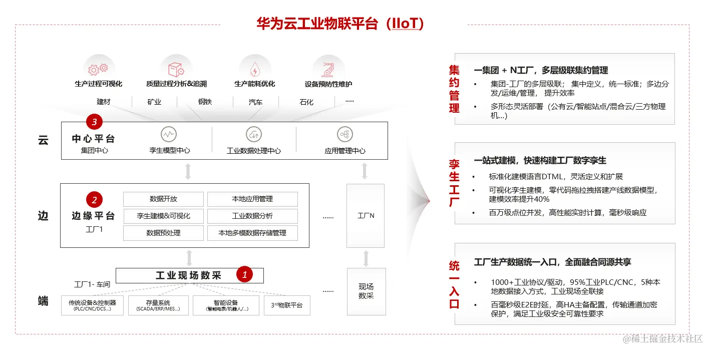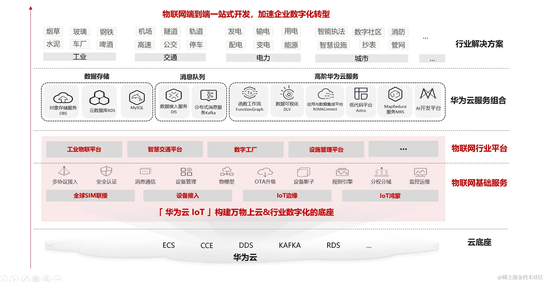 为了让千行万业实现数字化、智能化,华为云IoT构建了一个高性能、高可靠物联网平台,包含设备接入、IoT边缘等基础云服务,以及工业物联平台****、数字工厂、设施管理平台等行业平台。帮助广大的客户、伙伴、开发者,实现海量物联网设备的接入,同时还可以基于华为云强大的技术底座,组合华为云其他技术能力使用,在工业、交通、城市等行业中快速完成行业应用集成,构建场景化的物联网解决方案。