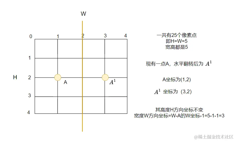 # Flip horizontal keypoints[:, 0] = width - keypoints[:, 0] - 1这句代码什么意思呢?其实就是将关键点水平翻转了一下,作图帮大家理解: