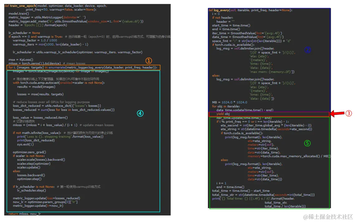 我们可以调试进入log_every函数中,注意到log_every函数中有一个yield obj,yield是python中的关键字,是一个生成器,每次log_every运行到yield obj时都会暂停执行下面的代码,而是将obj返回给调用方,这样做的目的是节省内存。