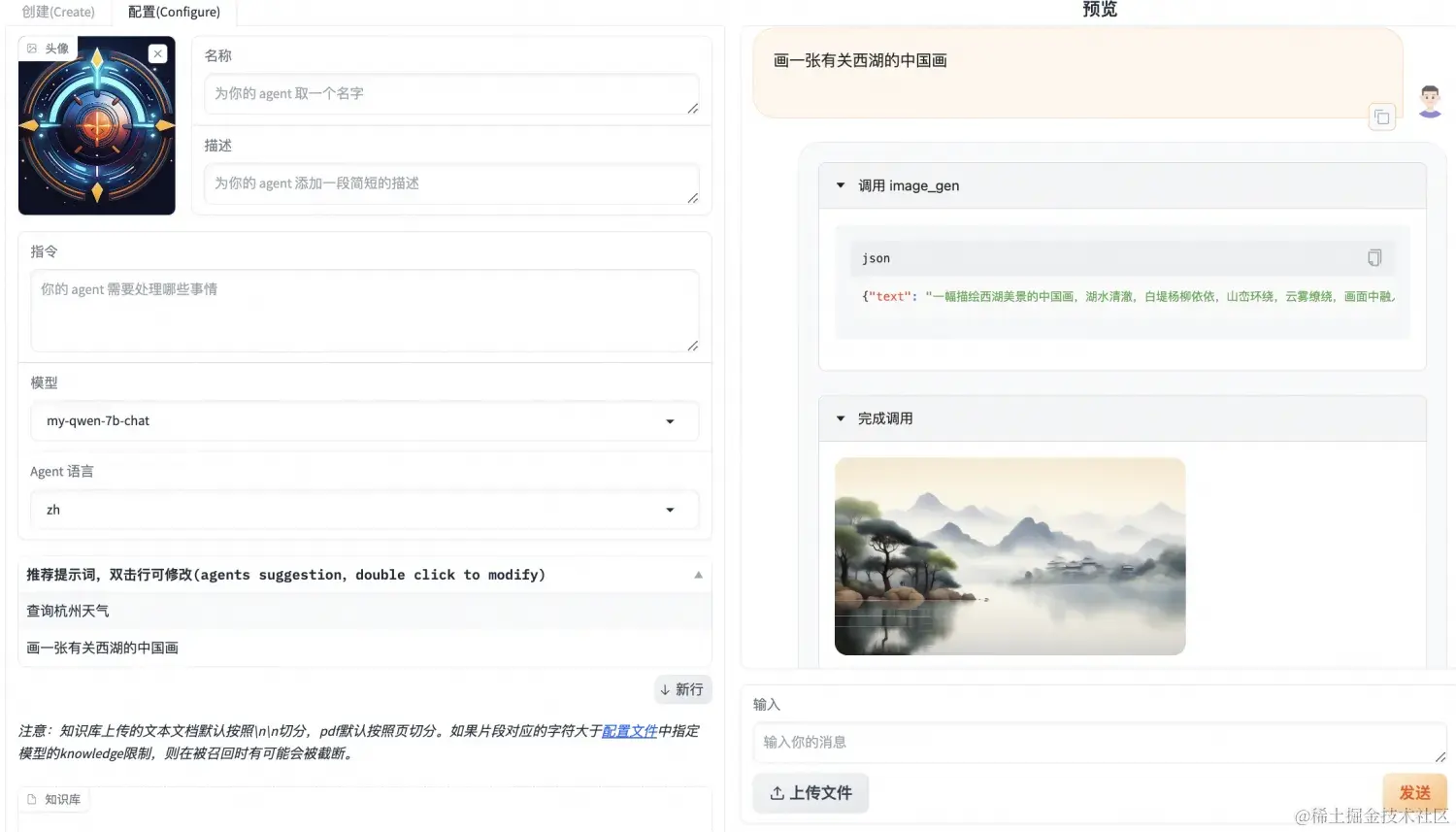 进入AgentFabric后,在配置(Configure)的模型中选择本地模型my-qwen-7b-chat