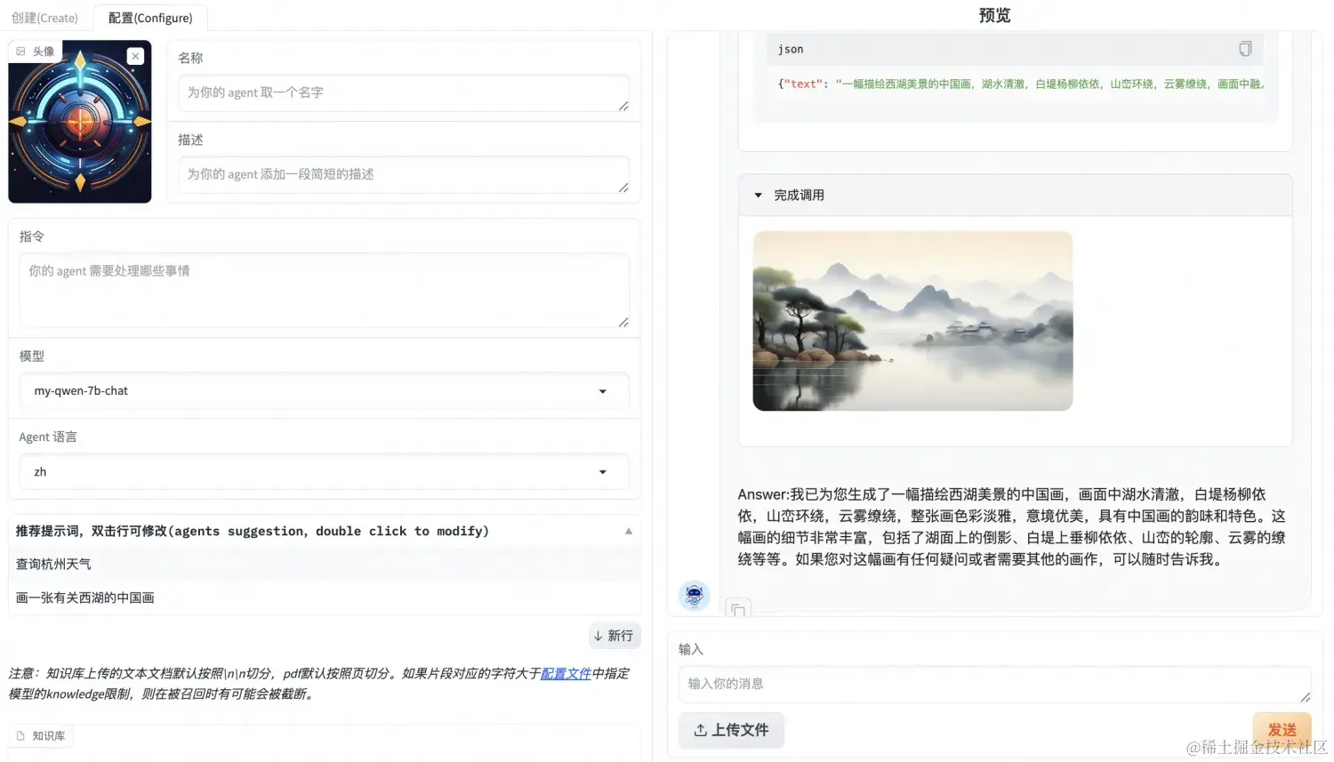 点击更新配置,等待配置完成后在右侧的输入栏中与Agent交互