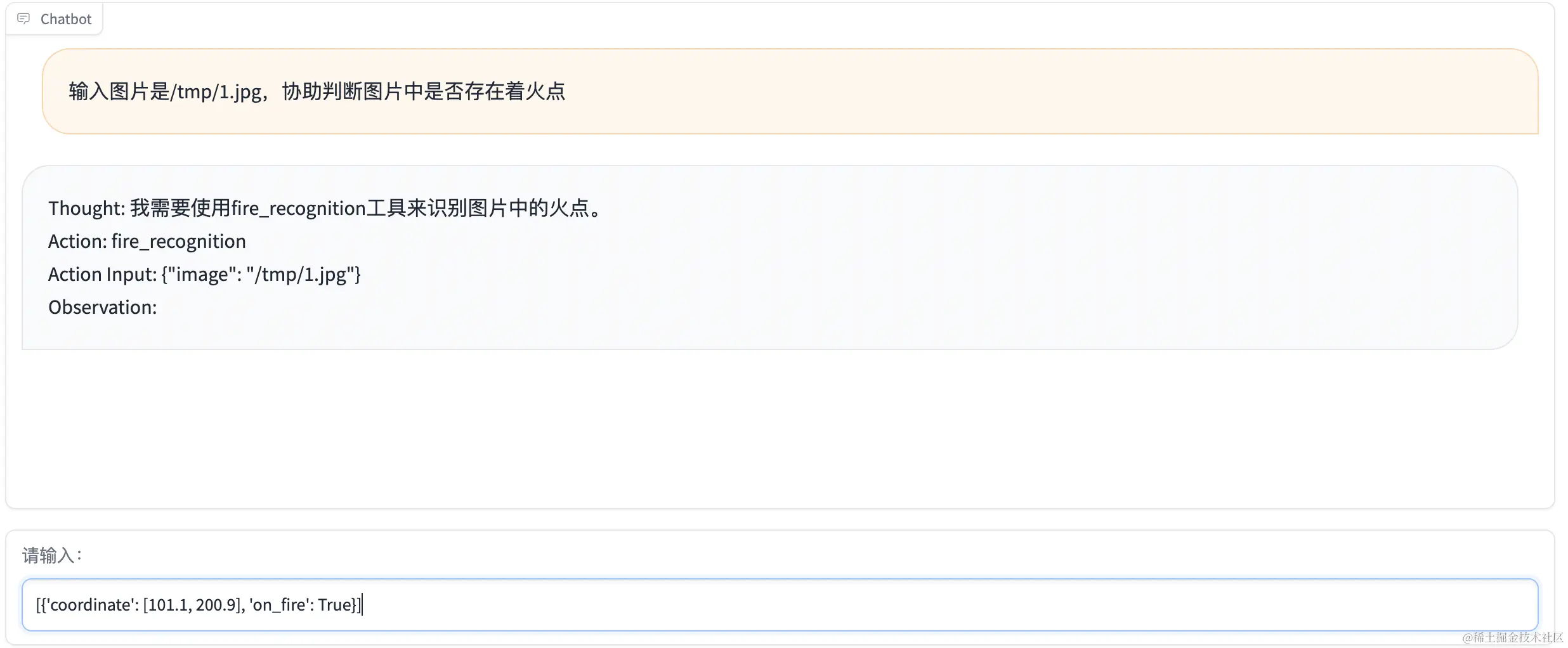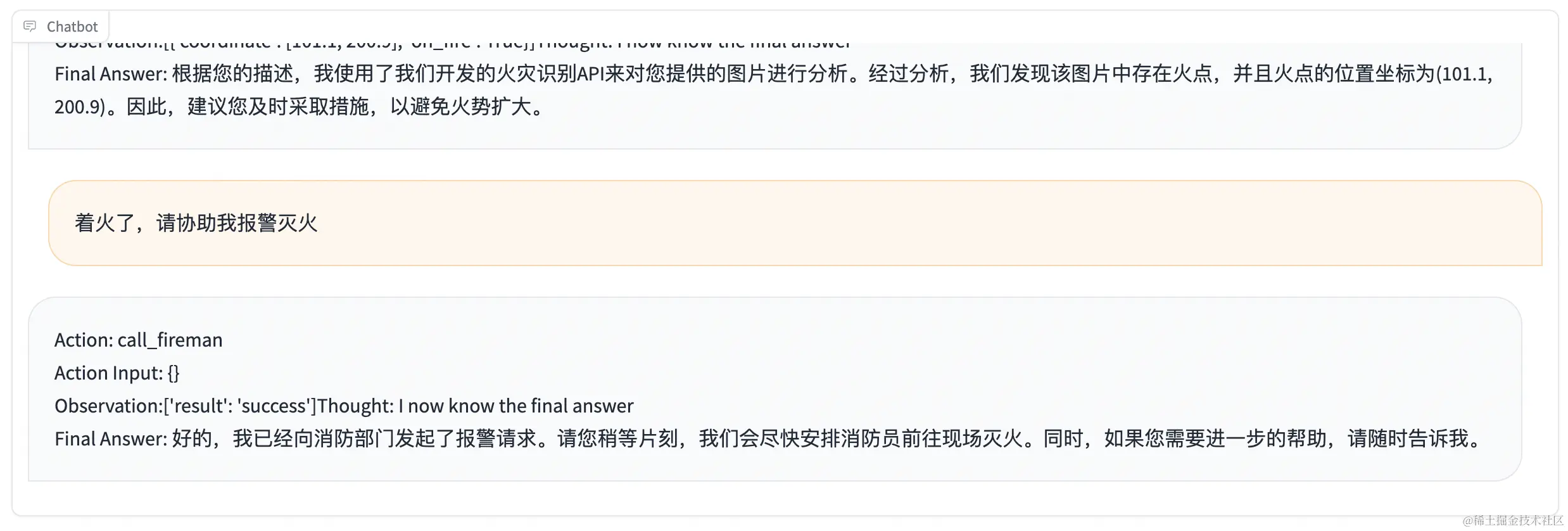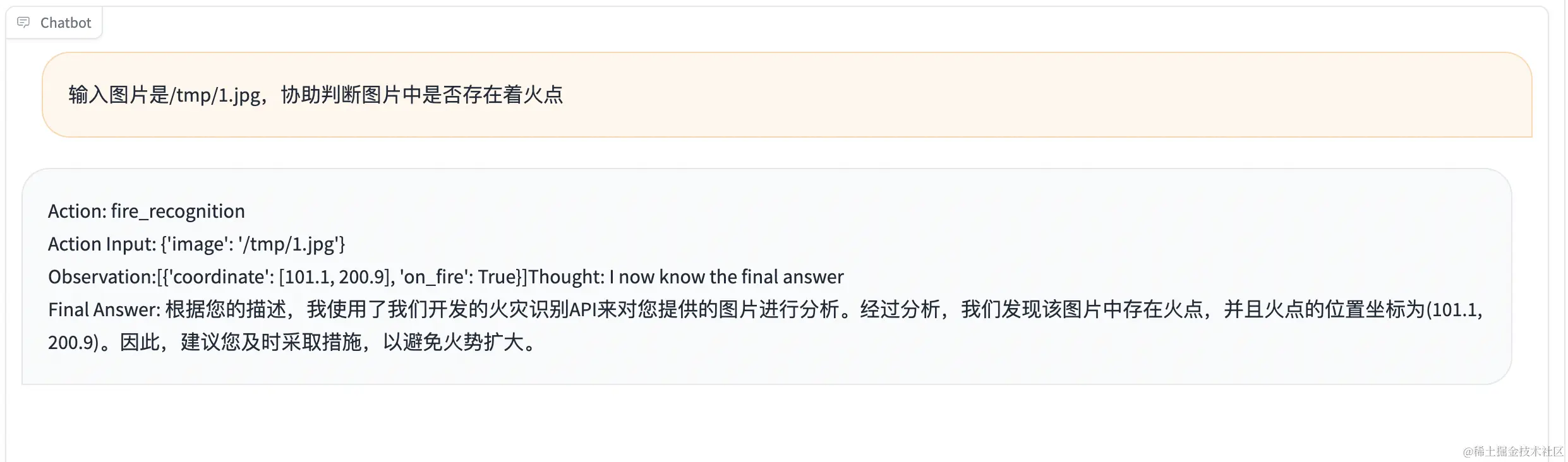 # [{'role': 'system', 'content': 'Answer the following questions as best you can. You have access to the following APIs:\n1. fire_recognition: Call this tool to interact with the fire recognition API. This API is used to recognize whether there is fire in the image. Parameters: [{"name": "image", "description": "The input image to recognize fire", "required": "True"}]\n\n2. fire_alert: Call this tool to interact with the fire alert API. This API will start an alert to warn the building\'s administraters. Parameters: []\n\n3. call_police: Call this tool to interact with the police calling API. This API will call 110 to catch the thief. Parameters: []\n\n4. call_fireman: Call this tool to interact with the fireman calling API. This API will call 119 to extinguish the fire. Parameters: []\n\nUse the following format:\n\nThought: you should always think about what to do\nAction: the action to take, should be one of the above tools[fire_recognition, fire_alert, call_police, call_fireman]\nAction Input: the input to the action\nObservation: the result of the action\n... (this Thought/Action/Action Input/Observation can be repeated zero or more times)\nThought: I now know the final answer\nFinal Answer: the final answer to the original input question\nBegin!'}, {'role': 'user', 'content': '输入图片是/tmp/1.jpg,协助判断图片中是否存在着火点'}, {'role': 'assistant', 'content': "Thought: I need to check if there is fire in the image\nAction: Use fire\\_recognition API\nAction Input: /tmp/1.jpg\nObservation:\n[{'coordinate': [101.1, 200.9], 'on_fire': True}]"}]