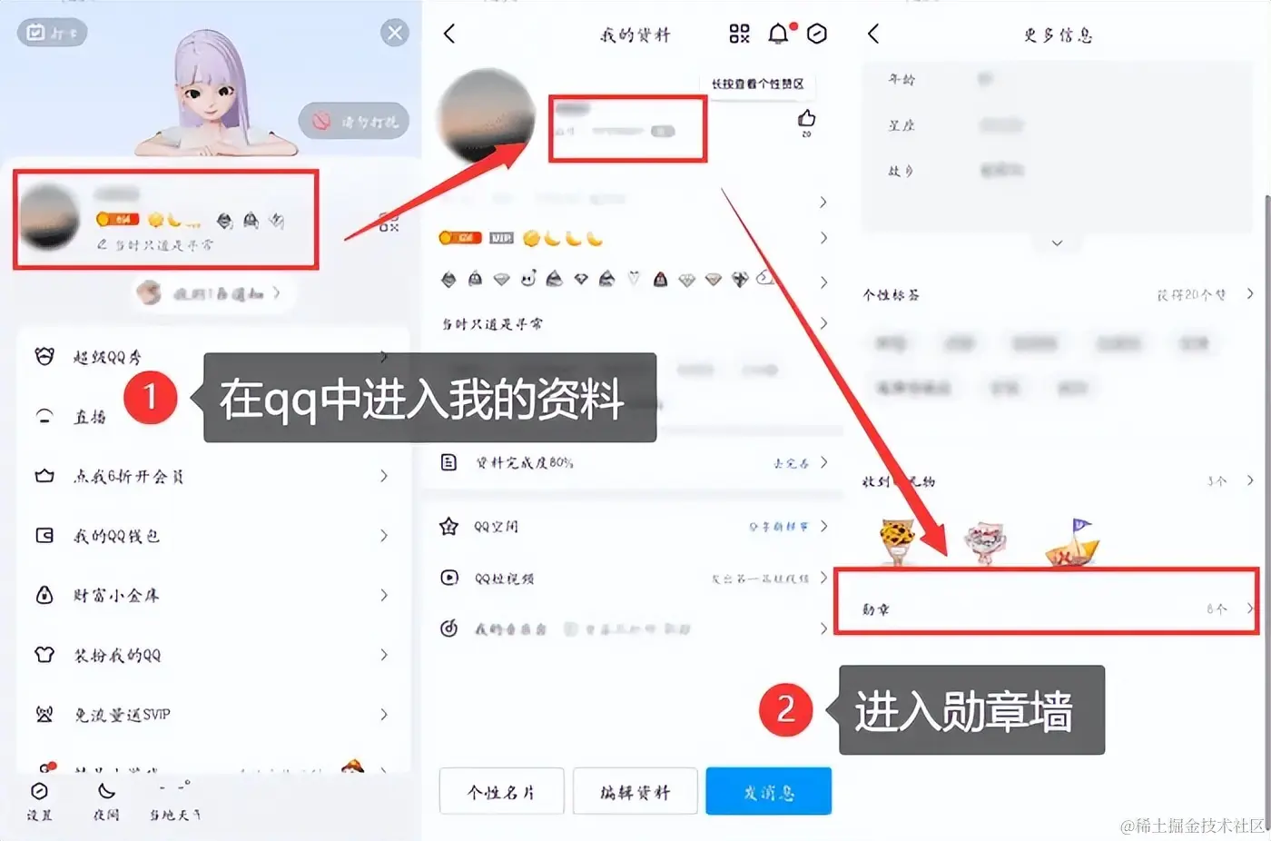 第一步:点击头像,进入 【我的资料】 ,再点击头像旁的账号,就能进入 【更多信息】 ,然后进入勋章墙。