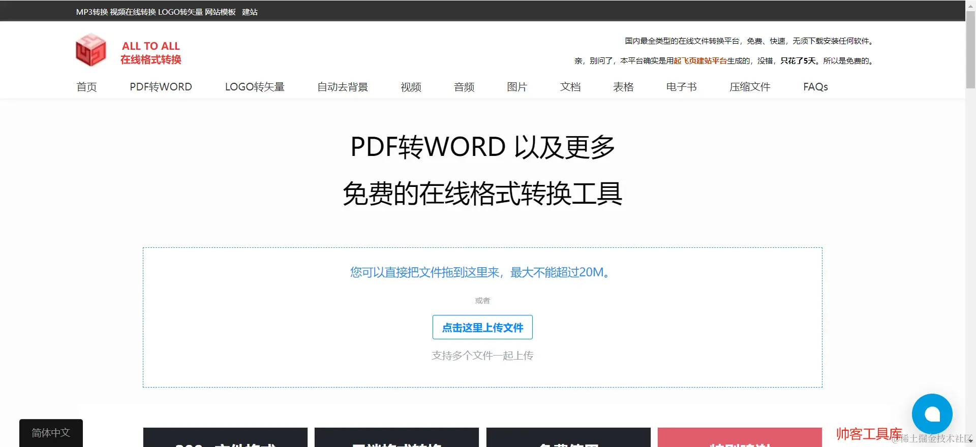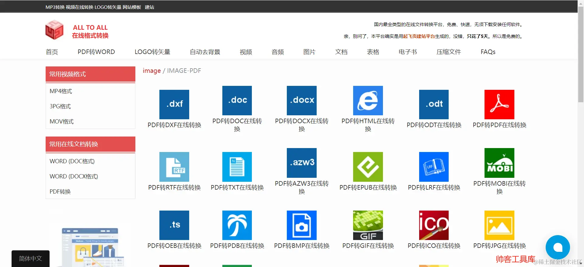 听名字就觉得这个工具挺厉害的,没错,ALL TO ALL 是一个提供在线文件格式转换服务的平台,提供了国内最全类型的在线文件转换服务,大概支持200多种格式的文件转换,包括视频、音频、图片、字体等多媒体文件,以及常见的 Office 文件、PDF、电子书等文档格式。