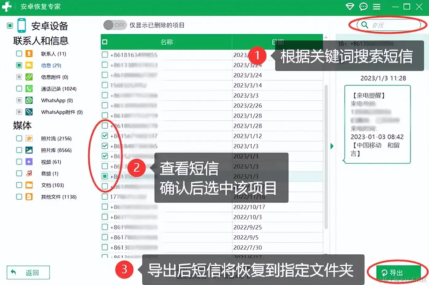 步骤3:扫描完成后,软件将显示可恢复的信息列表。用户可以选择根据关键词搜索,然后选中要恢复的信息,并设置保存路径,导出到电脑的指定文件夹中。