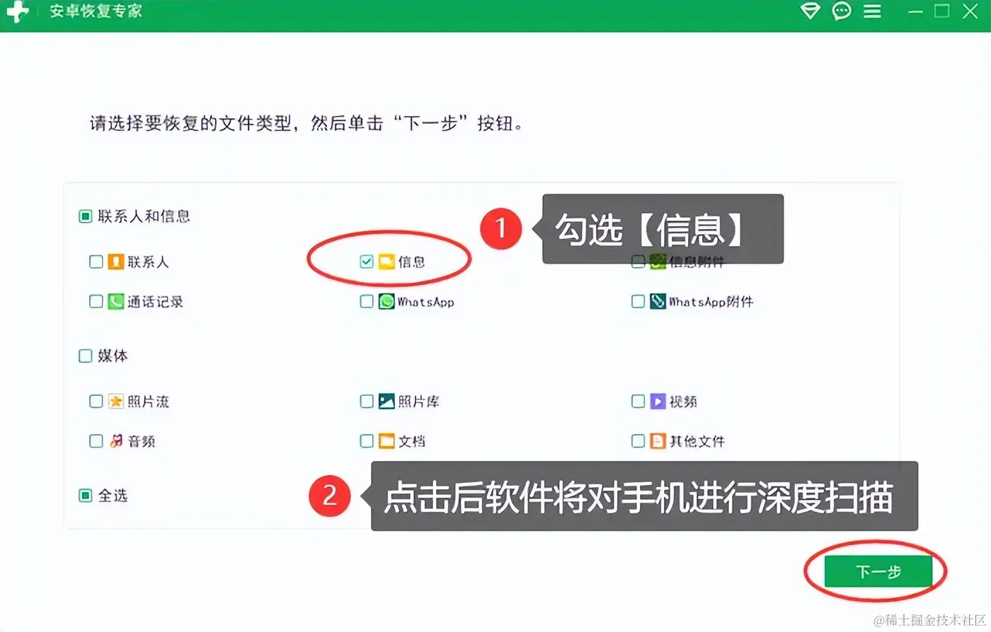 步骤2:一旦连接成功,用户将进入软件界面,这是可以自主选择需要回复的文件类型,接下来,点击【下一步】按钮,软件将对设备进行全面扫描,以查找可恢复的信息。