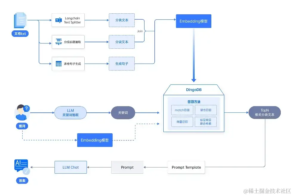 用户提出问题后,通过Embedding模型生成向量表示,在DingoDB中进行向量检索,找到最相关的多个文本块。关键词检索是为解决用户口头表达与专业文档不匹配而造成的检索不准确问题。关键词检索通过LLM提取关键词,输入DingoDB进行关键词匹配(match召回),找到相关文本块。DingoDB支持标量向量联合检索,结合关键词匹配和向量召回进行混合召回,返回TopN相关文本块。