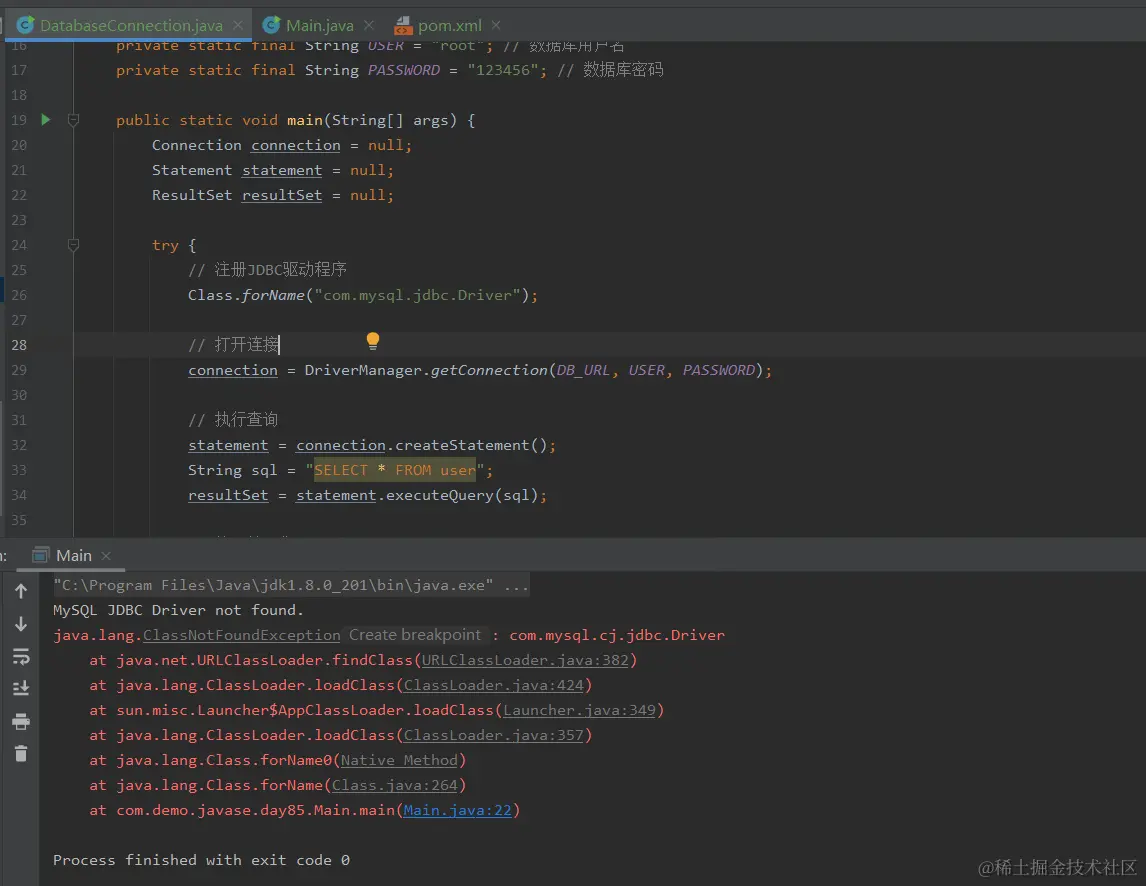 main方法,这是Java程序的起点。在main方法中,我们首先尝试加载MySQL的JDBC驱动程序。这个过程可以看作是告诉Java程序,我们要使用这个特定的驱动来与MySQL数据库进行通信。 -
