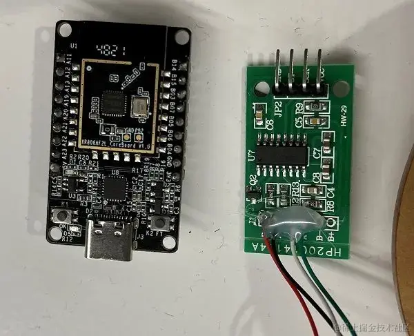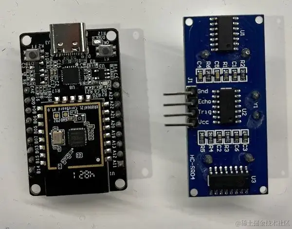 如上图示,左边为全志 xr806 模组,右边为超声波测距模块,echo 脚连接 PA19,Triq 脚连接 PA20,Vcc 脚连接 5V 电源,Gnd 脚接地,