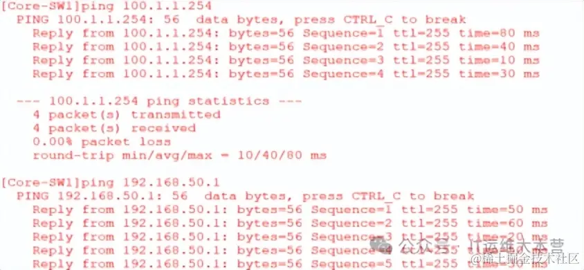 此时,在Core-SW上测试连通性正常: