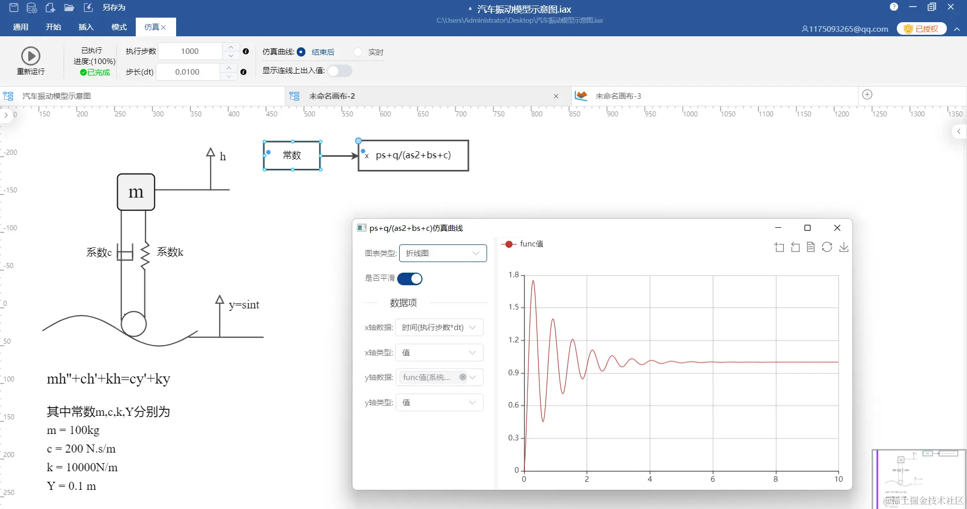 4.汽车震动模型仿真(左边为示意图,右边为仿真数据曲线)