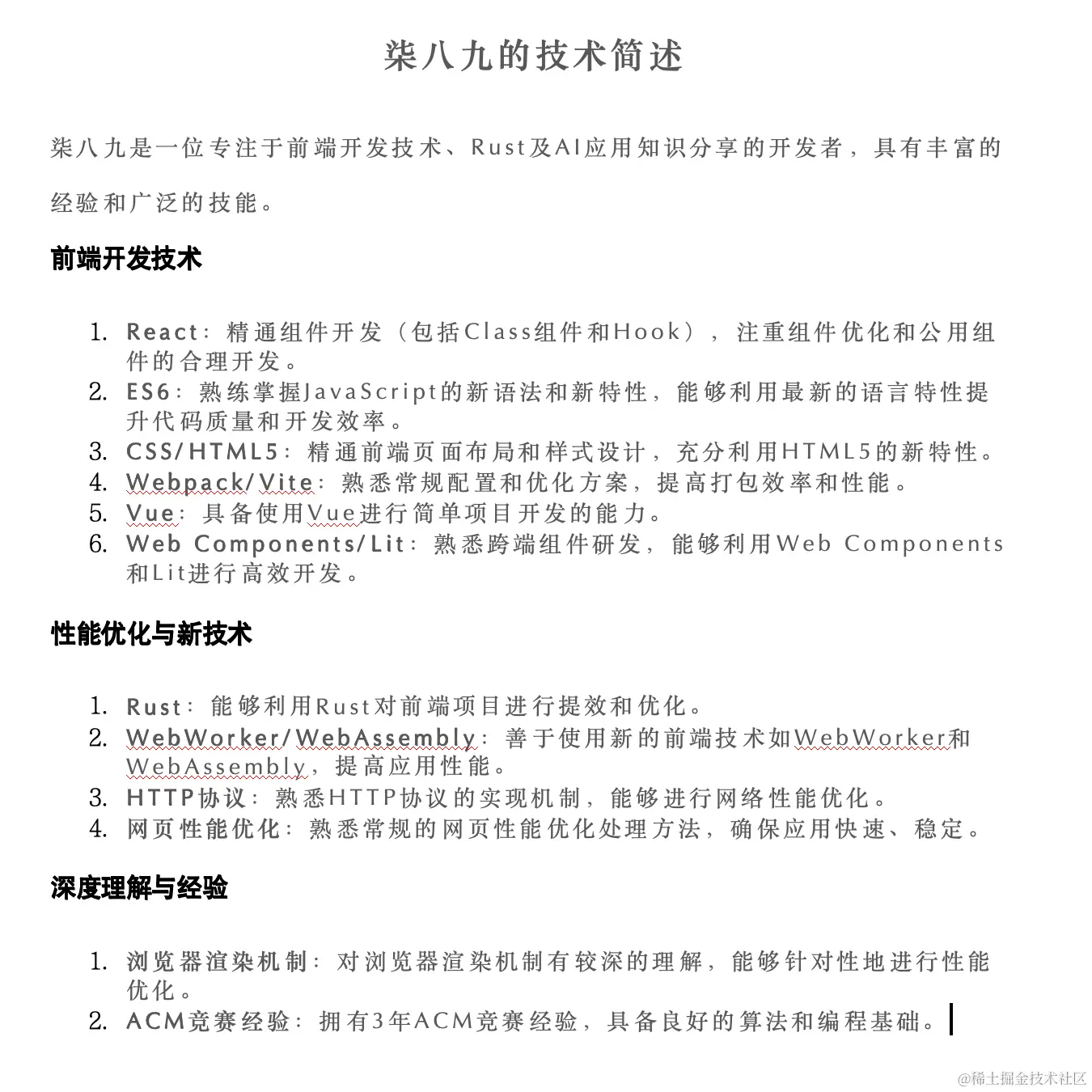 let text = "前端柒八九,专注于前端开发技术、Rust及AI应用知识分享的开发者";