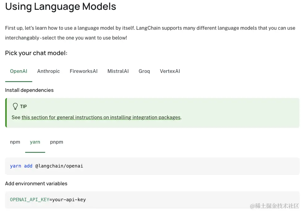 然后,我们需要选择对应的模型,LangChain可以支持市面上常见的模型,例如OpenAI/Anthropic等。与此同时,我们还需要配置对应模型的API KEY。
