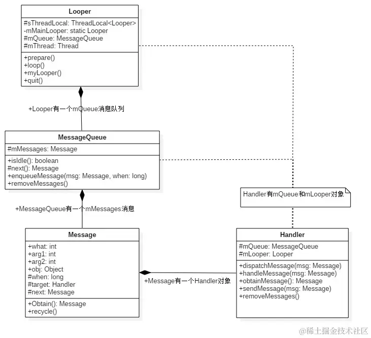 在Looper的构造函数中创建了MessageQueue,在loop过程中,通过死循环不断的获取消息。 可以通过Looper.myQueue()获取。